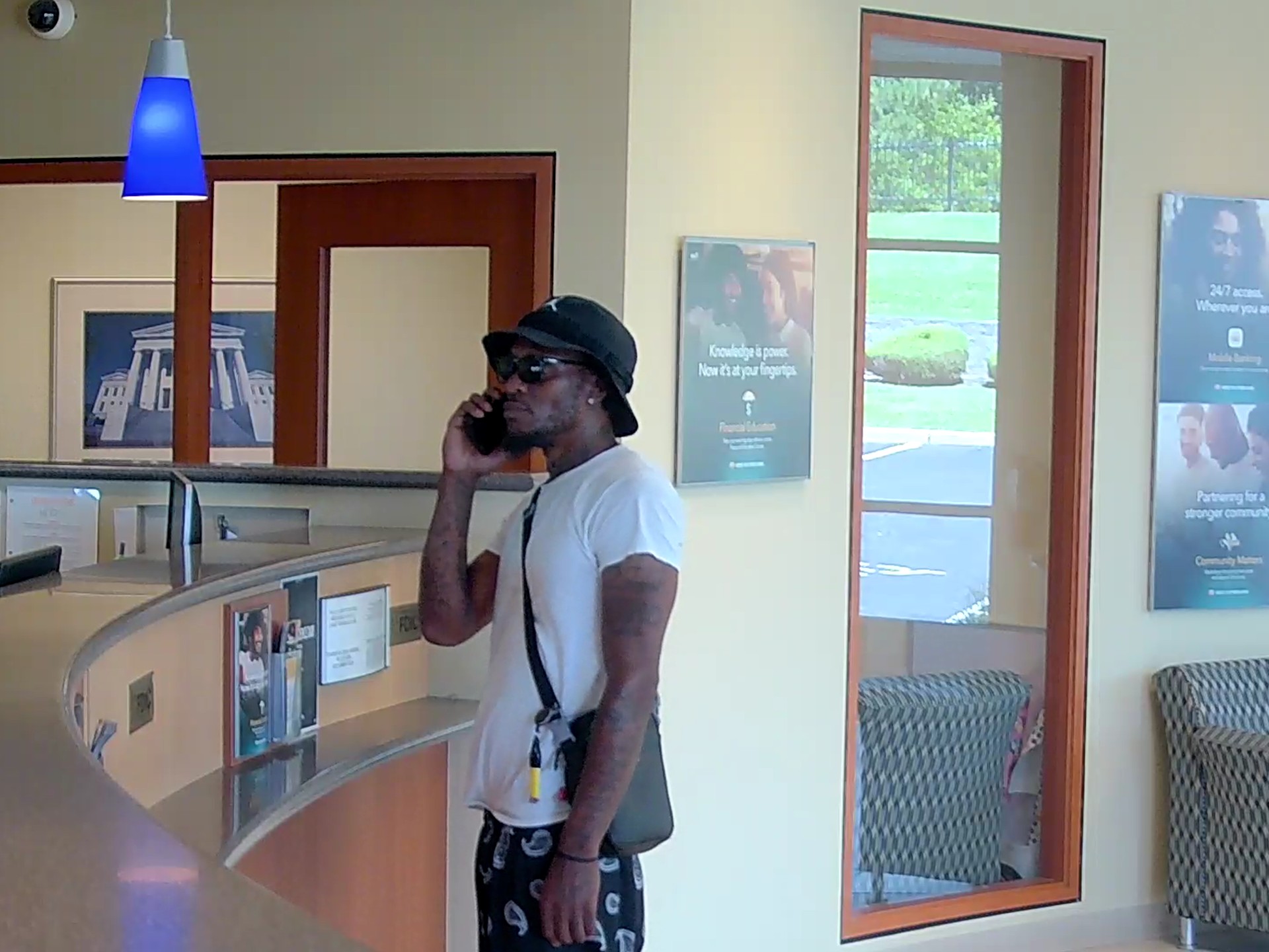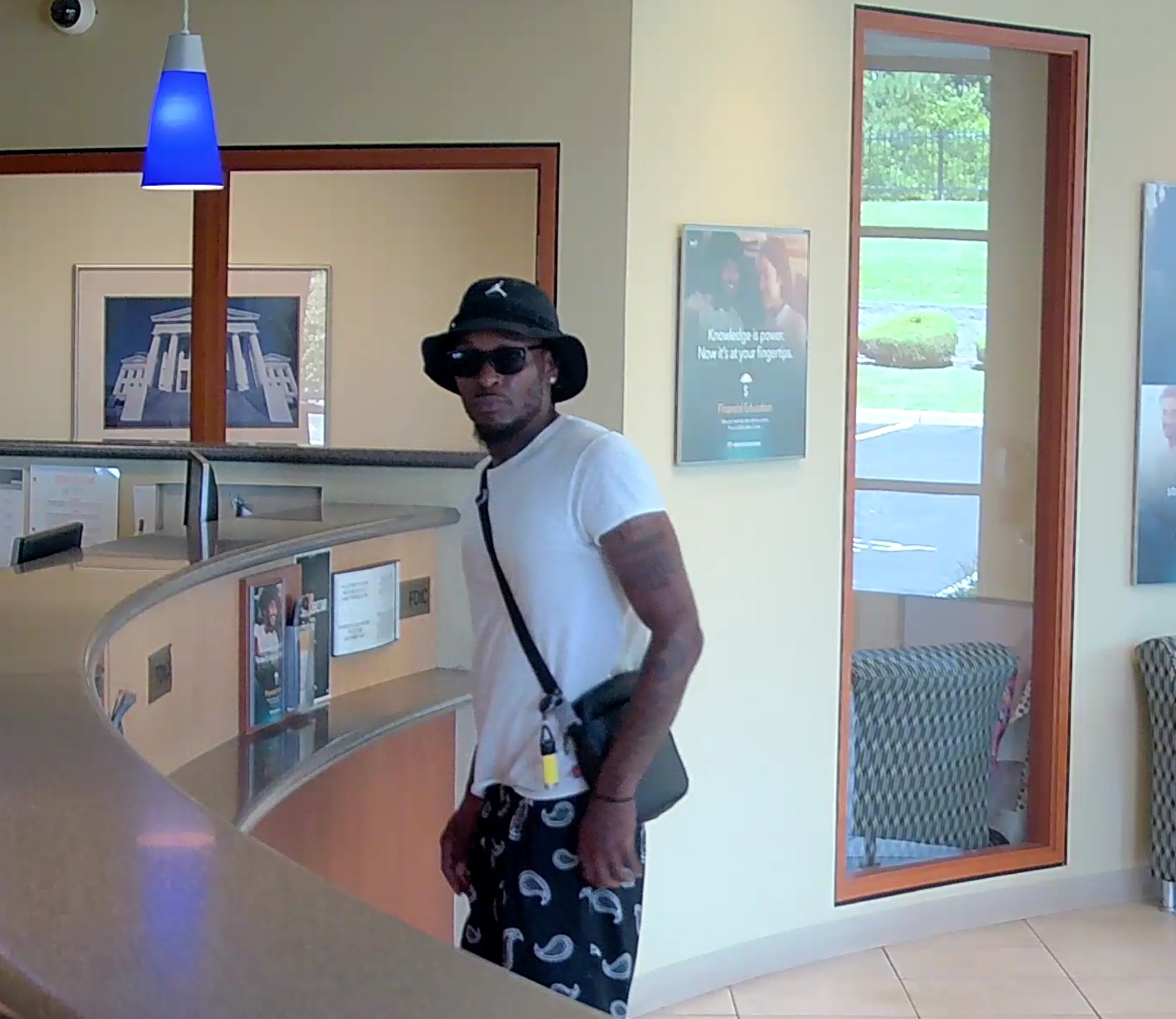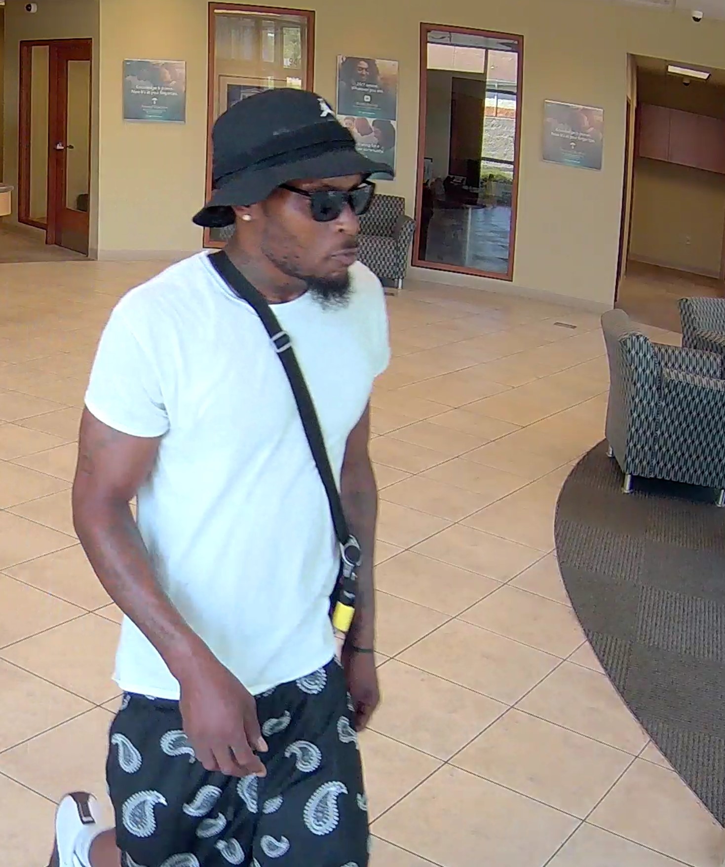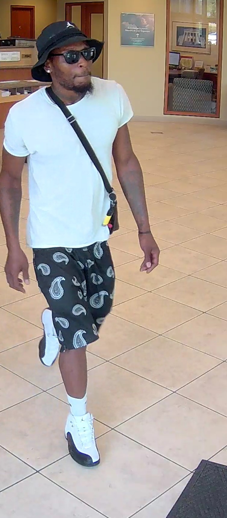 The suspect is described as a black male, approximately 6’0″ tall, thin-build, and was wearing black shorts with white designs, a white t-shirt, black sunglasses, a crossbody bag, white socks, black and white tennis shoes, and a black bucket hat.