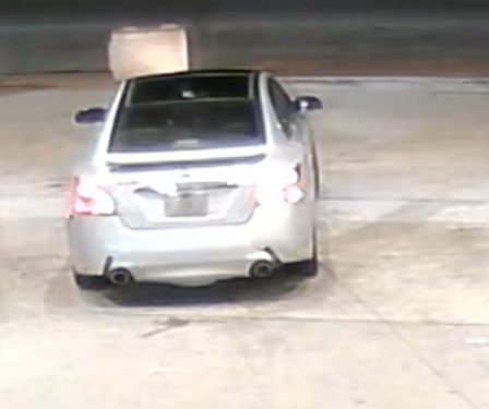 Suspect #1 is described as a black male, early 20’s, medium brown complexion, wearing a black hooded sweatshirt, black pants with white strips, an orange and yellow construction vest, and white/yellow Nike Jordan shoes. Suspect #2 is described as a black male, early 20’s, medium brown complexion, wearing a black hooded sweatshirt with the hood up, black mask, light-colored designer jeans, and black shoes. The suspects’ vehicle is described as a white or light grey colored Nissan sedan with a black top, black rims, and a spoiler. The car also appears to have damage to the passenger side of the front bumper.