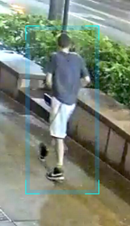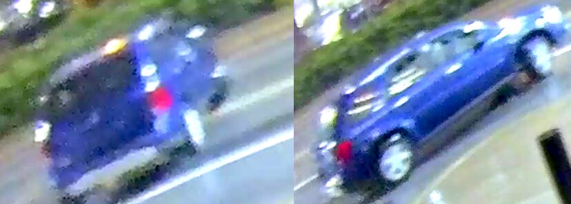 A review of surveillance in the area revealed that approximately four unknown subjects occupying a blue Pontiac Torrent with no license plates were identified as suspects of this incident.
